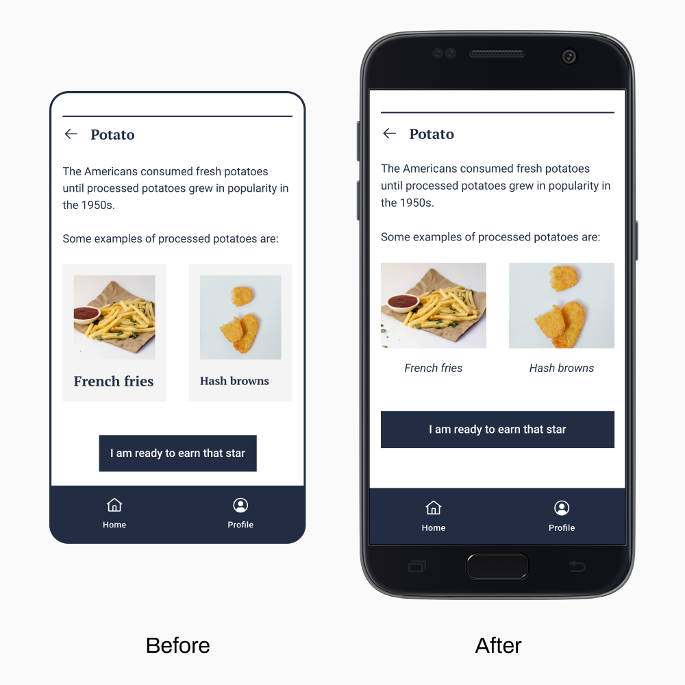 The concern raised on the Lesson page was that the image cards looked like buttons. I attempted not to make it look like a button by removing the background color. I also changed the font style to italic to make the text look like a caption.
